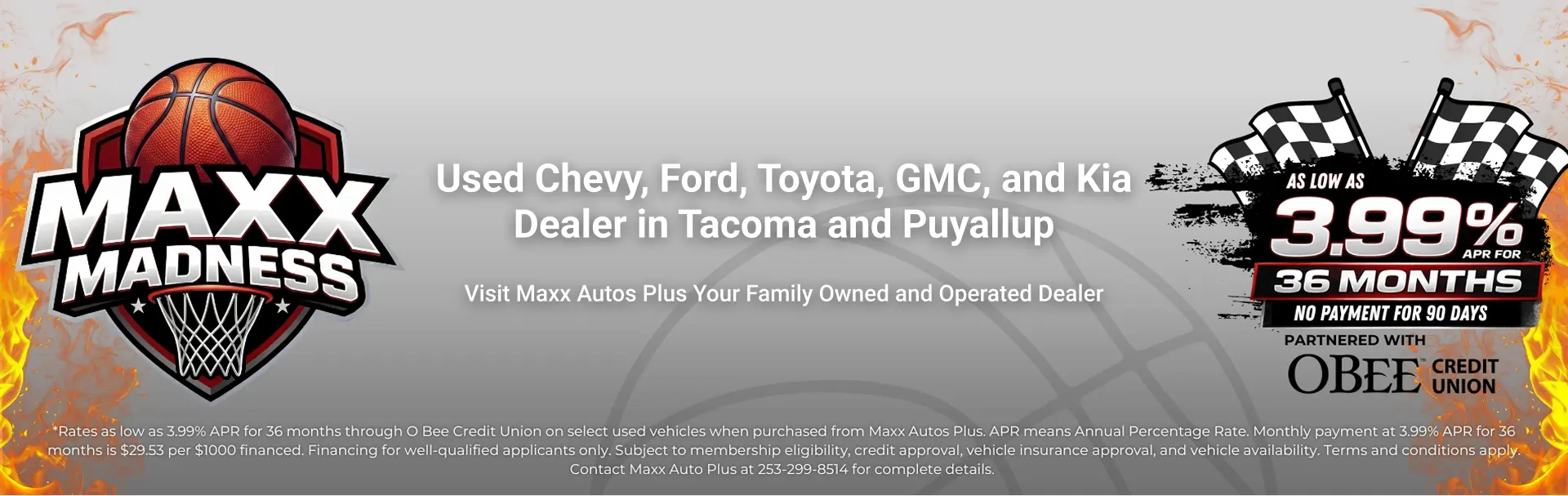 Rates as low as 3.99% APR for 36 months through O Bee Credit Union on select used vehicles when purchased from Maxx Autos Plus. APR means Annual Percentage Rate. Monthly payment at 3.99% APR for 36 months is $29.53 per $1000 financed. Financing for well-qualified applicants only. Subject to membership eligibility, credit approval, vehicle insurance approval, and vehicle availability. Terms and conditions apply. See Maxx Autos Plus for complete details on this and other offers.
